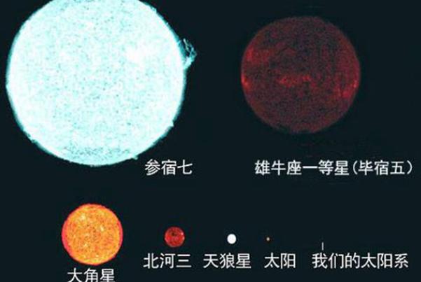 參宿七和參宿四相比參宿七更大,其中參宿七也被稱為獵戶座β,因在全天最亮的二十顆恒星中排行第七,所以被稱為參宿七,它的直徑為1.07184?108 km,質量約 21 M⊙(±3),直徑是太陽的77倍;而參宿三也被叫做獵戶座δ,與參宿一、參宿二組成獵戶座的腰帶,是位于獵戶座的聚星系統,質量大約是太陽的24~25倍。