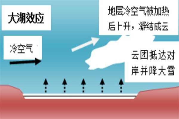 大湖效應指冷空氣在遇到大面積沒有結冰的水面后能夠得到水蒸氣和熱能,之后就會向風的湖岸形成降雨,一般都是以雪的形式出現。會形成大湖效應的原因是因為在夏季的時候,湖泊已經儲存了大量的熱量,在秋天來臨的時候,陸地表面就會降溫,熱量就會流失;在冬季的時候冷氣團從陸地經過未結冰的湖泊時,能從下面獲得熱量,氣團不穩定,從而形成云。