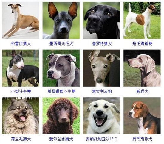 9、格雷伊獵犬、墨西哥無毛犬、普羅特獵犬、短毛獵狐梗、小型斗牛梗、斯塔福郡斗牛梗、意大利灰狗、威瑪犬、荷蘭毛獅犬、愛稱蘭水獵犬、安納托利亞牧羊犬、美國獵狐犬;