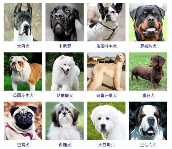 2、大丹犬、卡斯羅、法國斗牛犬、羅威納犬、英國斗牛犬、薩摩耶犬、阿富汗獵犬、臘腸犬、八哥犬、西施犬、大白熊犬、圣伯納犬;