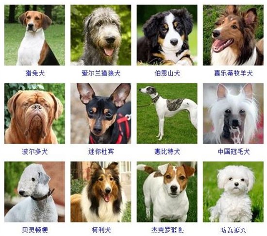4、獵兔犬、愛爾蘭獵狼犬、伯恩山犬、喜樂蒂牧羊犬、波爾多犬、迷你杜賓、惠比特犬、中國冠毛犬、貝靈頓梗、柯利犬、杰克羅素梗、哈瓦那犬;