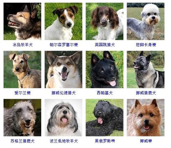 10、冰島牧羊犬、帕爾森羅塞爾梗、英國跳獵犬、短腳長身梗、愛爾蘭梗、挪威倫德獵犬、西帕基術、挪威獵鹿犬、蘇格蘭獵鹿犬、波蘭低地牧羊犬、黑俄羅斯梗、挪威梗犬;