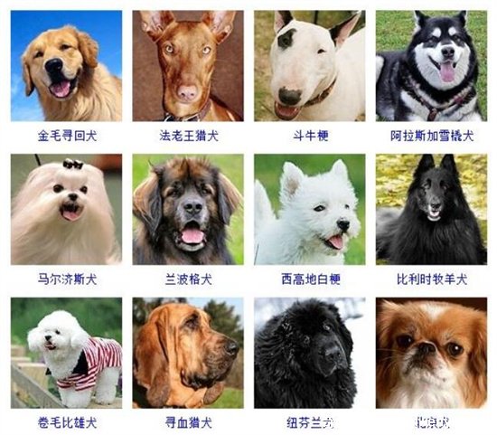 3、金毛尋回犬、法老王獵犬、斗牛梗、阿拉斯加雪橇犬、馬爾濟斯犬、蘭波格犬、西高地白梗、比利時牧羊犬、卷毛比雄犬、尋血獵犬、紐芬蘭犬、北京犬;