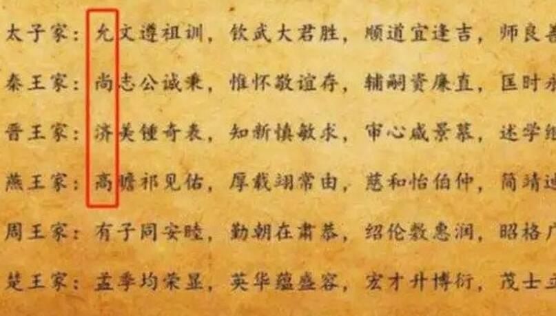 在《皇明祖訓》中朱元璋對于皇子們的名字輩分有著嚴格要求。其中太子朱標的兒子們必須用允字輩,例如朱允炆、朱允熥。秦王朱樉的兒子們必須用尚字輩,例如朱尚炳、朱尚烈。晉王朱棡的兒子們必須用濟字輩,例如朱濟熺、朱濟燁。而燕王朱棣的兒子們必須用高字輩,例如朱高熾、朱高燧。當然皇子們名字輩分的規定只是《皇明祖訓》中的一個內容而已。除了這個《皇明祖訓》中還有對禮儀、法律、職制等諸多方面的要求。朱元璋之所以要搞一個《皇明祖訓》最主要還是為了鞏固朱明皇權,同時也起著對子孫后代的訓誡作用。