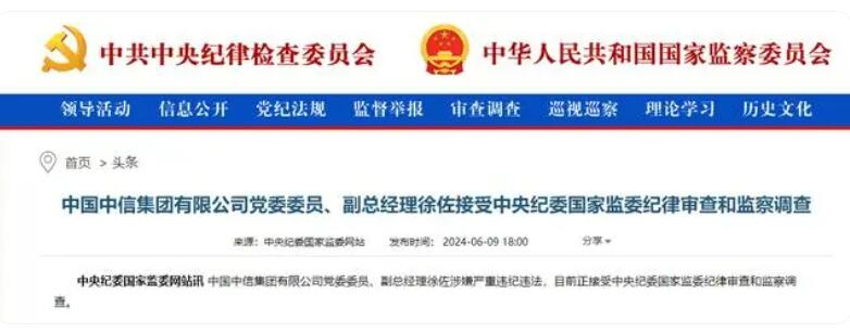 據中央紀委國家監委網站6月9日消息,中國中信集團有限公司黨委委員、副總經理徐佐涉嫌嚴重違紀違法,目前正接受中央紀委國家監委紀律...
