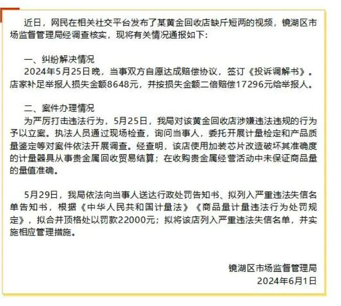 近日,網民在相關社交平臺發布了某黃金回收店缺斤短兩的視頻,鏡湖區市場監督管理局經調查核實,現將有關情況通報如下: