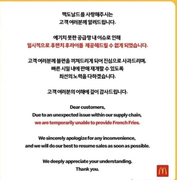 20日,據餐飲業界透露,韓國麥當勞決定暫時停止銷售炸薯條。韓國麥當勞也在官網上傳了公告。公告稱:由于意想不到的供應鏈內的熱點問題...